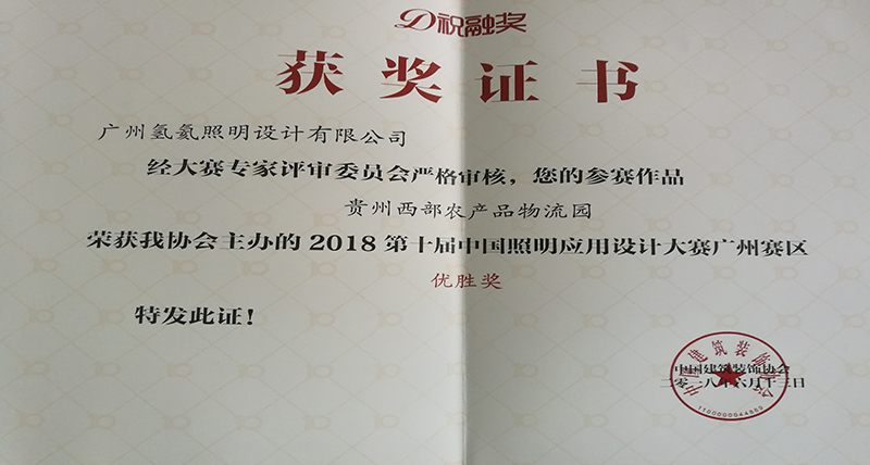 自2009年至今,祝融奖中国照明应用设计大赛已举办十届,自启动以来,承载了对中国光文化“传承、融合、创新”精神。今年我司有幸接受主办方的邀请参加2018第十届祝融奖广州赛区。经过严格的审核后我司以【贵州西部农产品物流园】项目荣获2018第十届中国照明应用设计大赛广州赛区“优胜奖”。虽然这是我司成立以来第一次参加,准备的也不是很充分,但是相信明年我们会获得更好的名次。