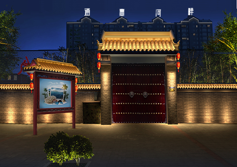 第二种是使用数码相机现场勘察拍摄的白天照片,乙方照明设计人员运用PS软件将白照片转化为夜景照明效果图。此方法优势是:相机拍摄的照片环境真实,还原度高。劣势是:由于照片里的环境都是真实的,有些场景就比较脏乱,导致使用照片处理的灯光效果图精美程度通常不如使用建筑效果图处理得漂亮。此方法也是照明效果图常用制作方式之一。如下图: