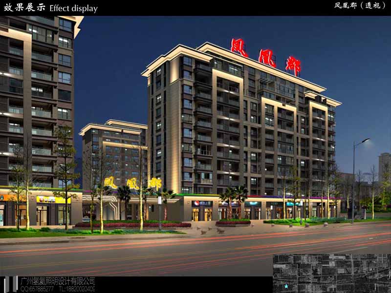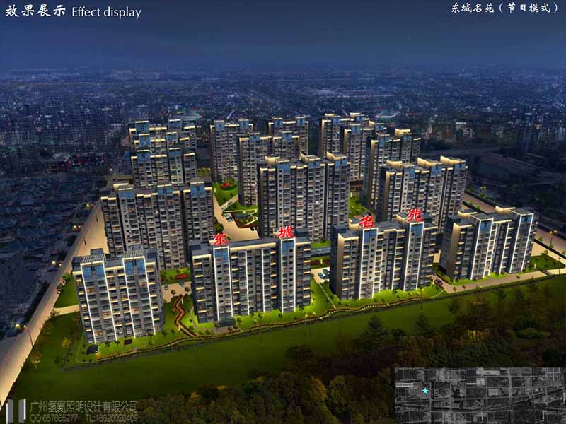 金鑫花园、东城名苑、凤凰郡、英伦都市、慧学名苑、科技城、上海电气、仁达都喜天丽酒店、高新区南庄安置区进行亮化新增设计。