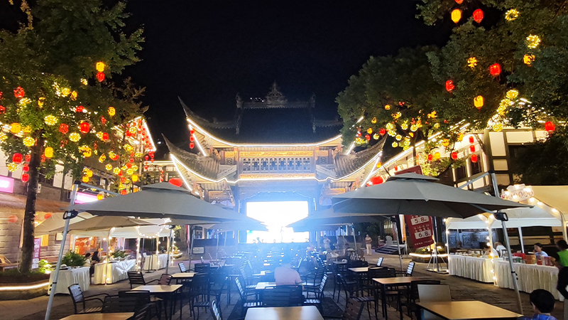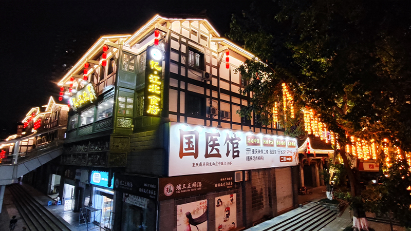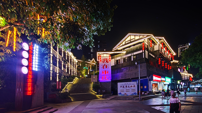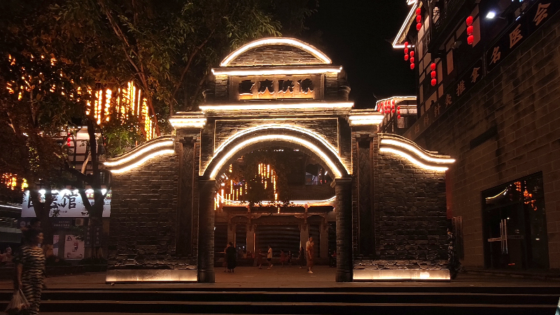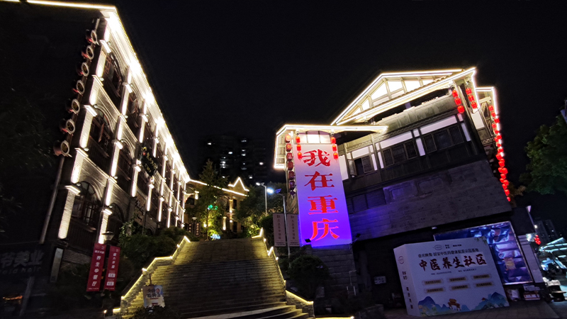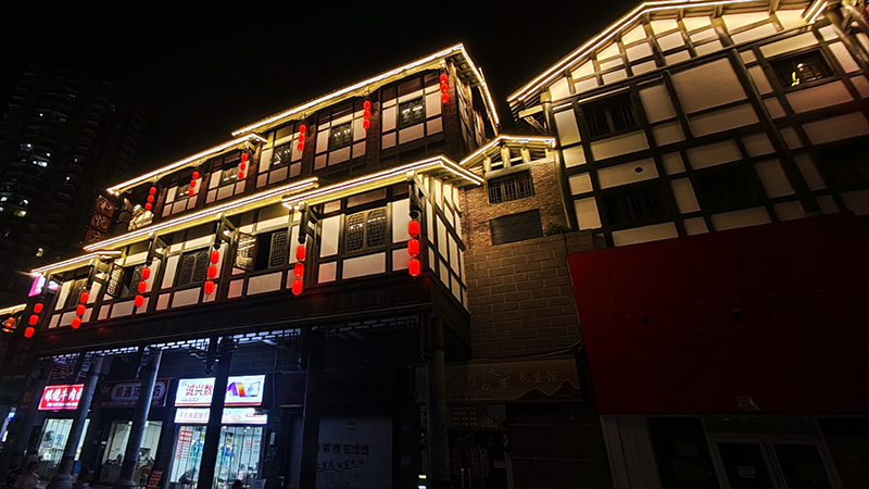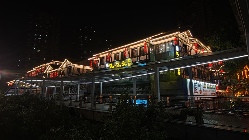 项目概况:位于重庆市南岸区南坪西路68号,金阳-重庆映像商业步行街为重庆市南岸区重点工程,位于通往石板坡长江大桥、菜园坝长江大桥、鹅公岩长江大桥和重庆市经济技术开发区的入口。处于南岸区商圈中心,位置极其优越,交通极为便利。项目总建筑面积逾4万平方米,以江北城复古建筑为主,是一条以休闲、旅游、特色餐饮和购物为一体的体验式感性主题街区。功能分布合理、人流车流畅通、城市配套齐全,规划有537个车位的大型停车场和上千平方米的休闲广场,构造一个公园式的开放街区,错落分布餐饮、休闲、娱乐、购物等多种业态,最终实现项目“一站式休闲娱乐”、“休闲中购物”。作为中式古建类夜游美食网红打卡地,灯光设计整体以3000K暖色调为主,烘托出温馨热闹的氛围。大量灯带的运用,完美打造出景区的灯光层次感和落差感。天桥瞭望,重庆映像的夜景尽收眼底,“我在重庆”几个大字赫然照亮了主入口。